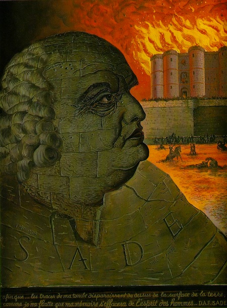 Proche de Marie-Laure de Noailles, descendante du Marquis de Sade, et de Nusch Eluard, femme de Paul, Man Ray sera rapidement attiré et fasciné par le célèbre Marquis. Son étude du personnage le mènera inévitablement à vouloir mettre un visage sur son fantasme. Ainsi, et uniquement pour cette raison, « Portrait imaginaire du Marquis de Sade » est sans doute l’œuvre la plus chargée de symbolique qu’ait pu faire Man Ray. Au bas du tableau, la dernière volonté de Sade : celle de vouloir disparaître de la mémoire des Hommes. Au-dessus, un Sade obèse regardant la Bastille en flamme : symbole de la victoire de l’esprit subversif. Man Ray peut être fier, car il signe ici une œuvre magistrale qui marquera les esprits : c’est d’ailleurs ce portrait que les gens ressortent quand on leur demande quelle tête a le Marquis de Sade, Van Loo pouvant évidemment aller se coucher !
