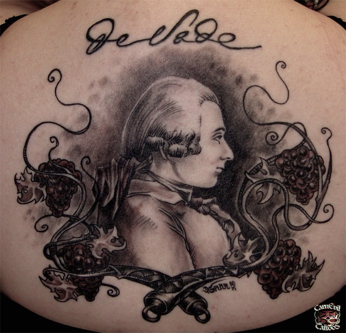Sources : « Moi le Marquis » – Scan et réécriture du texte : John » / « Portrait du Marquis De Sade » – Man Ray / Tatouage « Marquis de Sade » – D-GRRR / « Justine ou les Malheurs de Vertu » – Dubout